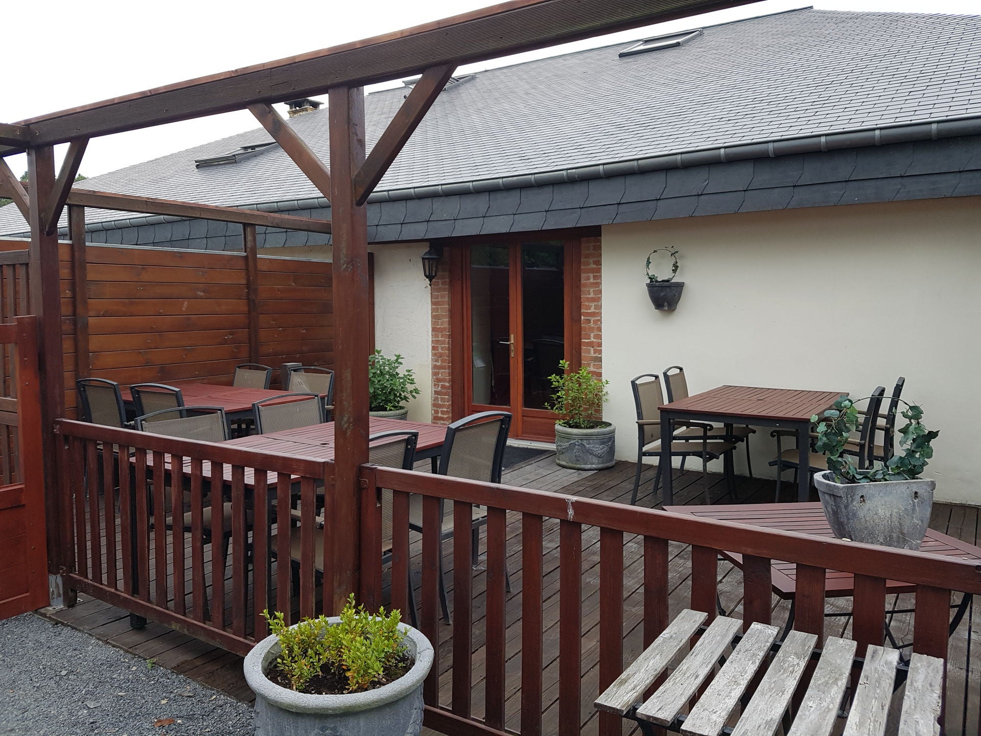 - 4 grote ronde tafels met 30 stoelen.